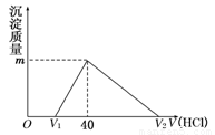 将一定量的钠铝合金置于水中,合金全部溶解,得到20 mL pH=14的溶液,然后用1 mol/L的盐酸滴定,沉淀质量与消耗盐酸的体积关系如图所示。