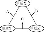 X、Y、Z三种短周期元素,原子半径的大小关系为:r(Y)>r(X)>r(Z),原子序数之和为16。X、Y、Z三种元素的常见单质在适当条件下可发生右图所示变化,其中B和C均为10电子分子。下列说法不正确的是