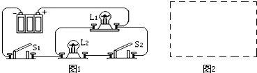 根据图1的实物图,在图2的方框中画出对应的电路图(要求:图中要标出L1、L2、S1、S2).