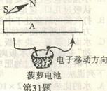 如图,将铜丝、铁丝插入菠萝中,便成了水果电池。一根软导线在纸筒A上绕成螺线管,导线两端接在电池两极上,螺线管产生的磁场使小磁针静止在如图状态。图中已标出电路中电子定向移动的方向。