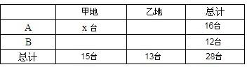 大桥局在A、B两地有闲置的挖土机16台和12台,现要运往甲、乙两地,其中甲地15台,乙地13台,从A、B两地分别运送一台挖土机到甲、乙两地的费用如下表: