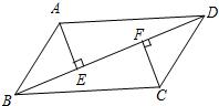 如图,□ABCD中,AE⊥BD,CF⊥BD,垂足分别为E、F。