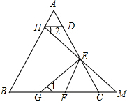 如图,在△ABC中,AB=AC,DE=EC,DH∥BC,EF∥AB,HE的延长线与BC的延长线相交于点M,点G在BC上,且∠1=∠2,不添加辅助线,解答下列问题: