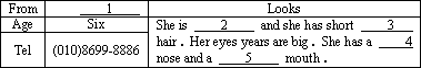 | Age | Six | She is 【小题2】 and she has short【小题3】 hair. Her eyes years are big. She has a 【小题4】 nose and a【小题5】 mouth. |