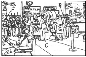 下面这张画描述的是发生在某机场候机厅的事。请看图,说一说此图的内容。