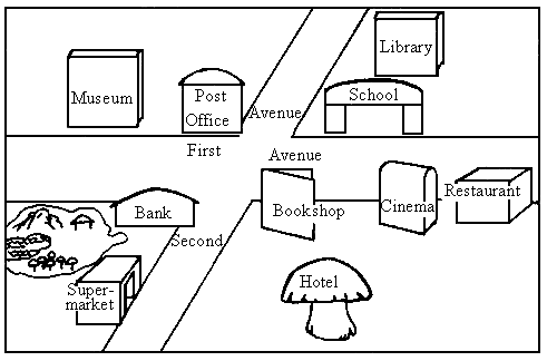Look at the picture. Can you find a museum? The museum is __1__ __2__the bank. What's __3__ __4__ the museum? There is a post office. On the __5__ of the bank is a supermarket. On the __6__ is a park. Can you find a school? What's __7__ the school? There is a library. Is there a hotel in the picture? Yes. What's in front of the hotel? There is a __8__ , a __9__ and a __10__.