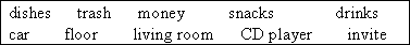 Peter wants to have a party on his birthday.Before the party,he has many things to do.First,he will(1)________some friends and has to drive his(2)________to pick them up.Then he has to borrow some(3)________from his parents to buy some(4)________and(5)________,and clean the(6)________.While having the party,if they want to listen to music,he should turn on the(7)________.After the party,he has to do the following things:do the(8)________,sweep the(9)________,and take out the(10)________.
