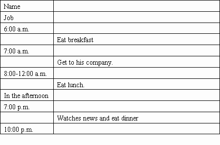 Hello, everyone. I'm Thomas. I'm a businessman. So I'm busy every day. In the morning, I have to get up at six o'clock and take a quick shower. At about half past six, I have some bread and milk for my breakfast. And at seven, I put on my coat and go to my company. At about eight I get to my company. The first thing I have to do after I get there is to have a meeting to tell my workers what to do for the day. I eat my lunch at twelve. In the afternoon I get back to my company and make a schedule for the next day. At seven in the evening I get home. And then at eight I watch the news on TV while I'm eating dinner. At ten, I go to bed. Oh, what a busy day!