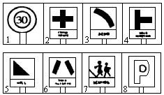 Number one is a sign with the number thirty on it. When drivers see this sign, they must not go at more than thirty kilometres one hour. We see this sign when we are getting near a town. Number two is a sign that we're near a crossing. We must drive carefully. Number three is a sign that there is a bend in the road. Again, we must drive slowly and carefully. It is not safe to go round a bend very fast. Number four is a sign that there is another road coming in from the right. There is a junction at this place. Number five is sign that there is a hill and number six is a sign that the road gets narrow. Drivers must go slowly and carefully. Number seven has the word “SCHOOL” on it. This is a sign that there is a school at the side of the street or the road. Perhaps there are children going to or leaving school. So drivers must look carefully and go slowly. Number eight is a sign with the letter “P” on it. The letter “P” means “Parking”. At some places, there're the signs “No parking” or “No waiting”. If a driver leaves his car near one of these signs, a policeman may come and write down the number of his car.
