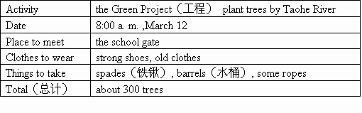 3月12日是植树节,你们三班参加了绿色工程活动,全班同学去桃河参加了植树劳动。请你根据表格中提供的信息,描述一下当天植树的经历和感受。表格内英文提示必须都用上。(字数60~70)