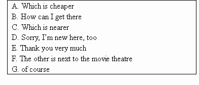 | 从方框中选择适当的选项,完成对话。其中有两项是多余的。 A: Excuse me! Could you please tell me where there's a good place to eat? B: 1 There are many good restaurants here. What do you like to eat? A: I like Italian food. So do you know where there are some Italian restaurants? B: Yes. We have two. One is on the Main Street, named Green L and. 2 called Sally's. A: 3 B: Sally's is a little nearer but it's expensive. A: What about Green Land? B: Green Land is farther but the food is both delicious and cheap. A: That's great! But _ 4 B: Go down the street and turn left at the third crossing. Then you will be on Main Street. You'll see Green Land between the post office and Milly's Cafe. A: 5 | |