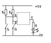 在汽车的两道门上。只要其中任何一个开关处于开路状态,发光二极管(报警灯)就发光。则该逻辑电路是 门电路,并在图中画出这种门电路的符号;当S1、S2都闭合时,A、B的输入都为 ,Y端输出为 ;当S1断开时, 端的输入为1,Y端输出为 。(门电路有输入电压或有输出电压都记为1,无输入电压或无输出电压都记为0) ![]()