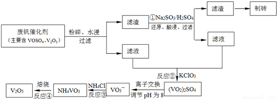 (3)为循环利用催化剂,科研人员最新研制了一种离子交换法回收钒的新工艺,回收率达91.7%以上。已知废钒催化剂中含有V2O5、VOSO4及不溶性残渣。查阅资料知:VOSO4可溶于水,V2O5难溶于水,NH4VO3难溶于水。该工艺的流程如下图。