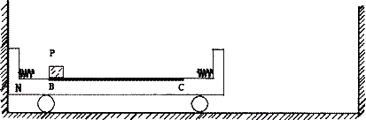 如图所示,一凹形滑板车N放置在有两堵墙壁的光滑水平地面上,滑板内侧两端各固定一弹簧,BC段水平且表面粗糙,Loc=3.5 m,其余段表面光滑,小滑块p的质量为m=1 kg,滑板车N的质量M=4 kg,p与BC面的动摩擦因数为μ=0.1,开始时滑板车紧靠左侧墙壁,p以V0=3 m/s的初速度从B点开始向右运动,当p滑到C点时,滑板车恰好与右墙壁碰撞并立即停下来但与墙壁不粘连,p继续滑动,p可视为质点,整个过程弹簧处于弹性限度内,取g=10 m/s2.问: