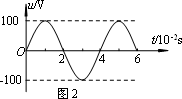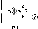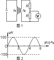 图1中的变压器为理想变压器,原线圈的匝数n1与副线圈的匝数n2之比为10∶1.变压器的原线圈接如图2所示的正弦式电流,两个20 Ω的定值电阻串联接在副线圈两端.电压表V为理想电表.则