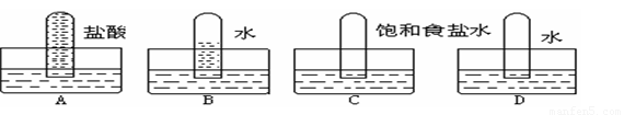 四支试管分别充满O2、NO2、C12、NH3四种气体,把它们分别倒立于盛有下列各种液体的水槽中,发生的现象如下图所示,其中充满C12的试管是 ![]()