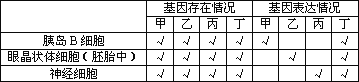 下表表示人体三种不同细胞中的基因存在及表达情况: