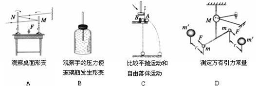 | A、 观察桌面形变 | B、 玻璃瓶发生形变 | C、 比较平抛运动和自由落体运动 | D、 测定万有引力常量 |