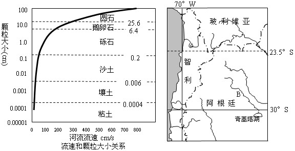 材料三 B河上、下游流速与颗粒大小关系图(图8)