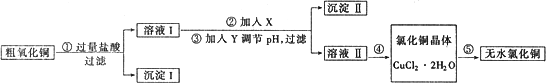 某化学小组用粗氧化铜(含少量氧化亚铁及不溶于酸的杂质)制取无水氯化铜,其实验流程如下所示:![]()