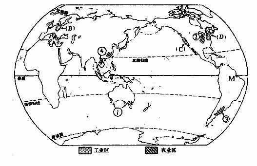 (3)字母A、B、C、D代表世界著名工业区,其中A区是     ,B区是     (填工业区名称),该地区____资源丰富,但是___资源需要由外地运入,四个工业区中发展条件相类似的是______和_____。(填字母)