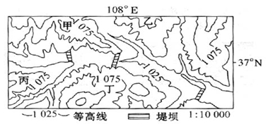 3在甲、乙、丙、丁四个观测点中,能直接观察到三道堤坝的点是 ( )