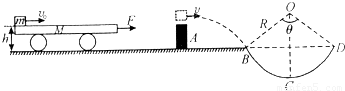 0=8m/s的初速度从左端滑上平板车,同时对平板车施加一水平向右、大小为5N的恒力F,当滑块运动到平板车的最右端时,二者恰好相对静止,此时撤去恒力F,当平板车碰到障碍物A时立即停止运动,滑块水平飞离平板车后,恰能无碰撞地沿圆弧切线从B点切入光滑竖直圆弧轨道,并沿轨道下滑,已知滑块与平板车间的动摩擦因数μ=0.5,圆弧半径为R=2m,圆弧所对的圆心角∠BOD=θ=106°,取g=10m/s