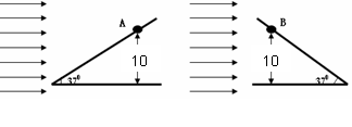 两根完全相同的光滑的细直杆上各套有一个完全相同的小球,均与水平面成为37°角放置,将两小球均从离地面10m高处由静止释放,如图所示。在水平向右的风力作用下,A球保持静止,B球沿细直杆下滑。求B球滑到地面所需时间为多少?(g=10m/s2)