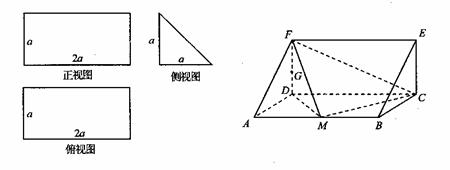 (本小题满分12分)一个多面体的三视图和直观图如图所示,其中正视图和俯视图均为矩形,侧视图为直角三角形,M、G分别是AB、DF的中点.
