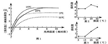 将某种植物置于CO2浓度适宜、水分充足的环境中,温度分别保持在5℃、15℃、25℃和 35℃下,改变光照强度,测定CO2的吸收速率,得到图1所示的结果。处理图1中有关数据得到图2、图3。下列叙述不正确的是( )