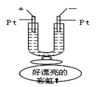 试液,通直流电,一段时间后U型管内会形成一个倒立的三色 “彩虹”,从左到右颜色的次序是( )![]()