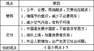 | 反对 | 1.中国是发展中国家,不能盲目学西方; 2.油价上涨,加重消费者负担; 3.失业人数增加,会产生其它社会问题。 |