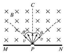 如图所示,在屏MN的上方有磁感应强度为B的匀强磁场,磁场方向垂直纸面向里.P为屏上的一小孔,PC与MN垂直.一群质量为m?带电荷量为-q的粒子(不计重力),以相同的速率v,从P处沿垂直于磁场的方向射入磁场区域.粒子入射方向在与磁场B垂直的平面内,且散开在与PC夹角为θ的范围内.则在屏MN上被粒子打中的区域的长度为( )![]()