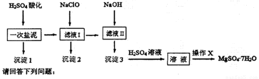 MgSO4?7H2O在医药上常用做泻药,工业上可用氯碱工业中的一次盐泥为原料生产。已知一次盐泥中含有镁、钙、铁、铝、锰的硅酸盐和碳酸盐等成分。其主要工艺如下:![]()