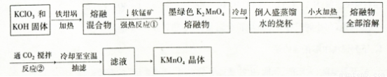 高锰酸钾是常用的氧化剂。工业上以软锰矿(主要成分是MnO2)为原料制备高锰酸钾晶体。下图是实验室制备的操作流程:![]()