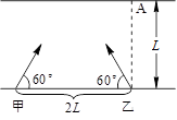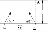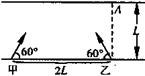 如图所示,河的宽度为L,河水流速为u,甲、乙两船均以静水中的速度v同时渡河.出发时两船相距2L,甲、乙船头均与岸边成600角,且乙船恰好能直达正对岸的A点.则下列判断正确的是( ) ![]()