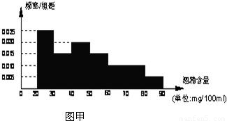 之间,属于酒后驾车,血液酒精浓度在80mg/100ml(含80)以上时,属醉酒驾车.”2009年8月15日晚8时开始某市交警一队在该市一交通岗前设点对过往的车辆进行抽查,经过两个小时共查出酒后驾车者60名,图甲是用酒精测试仪对这60名酒后驾车者血液中酒精浓度进行检测后依所得结果画出的频率分布直方图.