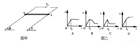 如图甲所示,在倾角为θ的斜面上固定有两根足够长的平行光滑导轨,两导轨间距为L,金属导体棒ab垂直于两导轨放在导轨上,导体棒ab的质量为m,电阻为R,导轨电阻不计,空间有垂直于导轨平面的匀强磁场,磁感应强度为B。当金属导体棒ab由静止开始向下滑动一段时间t0,再接通开关S,则关于导体棒ab 运动的v-t图象(如图乙所示)不可能的是