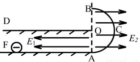 如图所示,ACB为光滑圆弧轨道其半径为R,O为其圆心,OD为水平台面。AF为光滑水平面且与圆弧ACB光滑连接。已知:在DFAO区域存在水平向左的匀强电场,场强大小为E1,AOB右侧空间存在水平向右的匀强电场,场强大小为E2,且E1=E2。在AE水平面上有一个质量为m,电荷量为q的带负电小球(可看作质点)。若其重力mg=qE1 问(1)至少从距离A点多远处无初速度释放该小球才能使其通过B点。