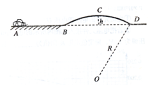 如图所示,AB段路面是水平的,BCD是一段半径R =10m的拱起的圆弧路面,圆弧的最高点C比AB段路面高出h =1.25m。已知一辆电动玩具车的质量为m=3kg,额定功率为20W。该玩具车自A点以额定功率由静止开始运动,经12s到达C点时恰好对地面压力为零,不计玩具车经过B点时的能量损失(g取10m/s2)。求: