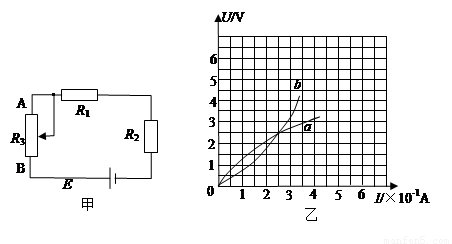 3.将上述电子元件R1 和另一电子元件R2接入如图所示的电路甲中,它们的伏安特性曲线分别如图乙中oa、ob所示。电源的电动势E=6.0V,内阻忽略不计。调节滑动变阻器R3,使电子元件R1和R2消耗的电功率恰好相等,则此时电子元件R1的阻值为