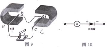 小满同学做了一个如图9所示的装置。闭合开关,用外力使导体ab水平向右运动,发现导体棒cd也随之运动起来,则实验装置中甲部分应用的物理原理是 ,乙部分产生的现象与 的工件原理相似。