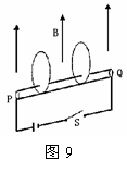 如图9所示,电源电动势为3V,内阻不计,导体棒PQ质量为0.06kg,长为1m、电阻为15Ω,匀强磁场竖直向上,磁感强度B=0.4T;当开关S闭合后,棒从固定的光滑绝缘环的底端上滑并在环上摆动,摆动一段时间后稳定在某一位置.求在该位置上棒对每只环的压力的大小.