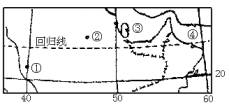 (1)图中①~④四城市中,________(填城市代号)是沙特阿拉伯首都。