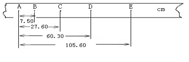 (6分)在研究匀变速直线运动规律的实验中,小车在某一力的作用下作匀加速运动,图为一次记录小车运动情况的纸带。图中A、B、C、D、E为相邻的计数点,相邻计数点的时间间隔为T=0.1秒,则:![]()