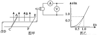 如图甲所示,不计电阻的“U”形光滑导体框架水平放置,框架中间区域有竖直向上的匀强磁场,磁感应强度B=1.0T,有一导体杆AC横放在框架上,其质量为m=0.10kg,电阻为R=4.0Ω。现用细绳栓住导体杆,细绳的一端通过光滑的定滑轮绕在电动机的转轴上,另一端通过光滑的定滑轮与物体D相连,物体D的质量为M=0.30kg,电动机的内阻为r=1.0Ω。接通电路后,电压表的示数恒为U=8.0V,电流表的示数恒为I=1.0A,电动机牵引原来静止的导体杆AC平行于EF向右运动,其运动的位移—时间图像如图乙所示。取g=10m/s2。求:匀强磁场的宽度;