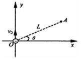 如图所示,在真空中有一与x轴平行的匀强电场,一电子由坐标原点O处以速度v0沿y轴正方向射入电场,在运动中该电子通过位于xoy平面内的A点,A点与原点O相距L,OA与x轴方向的夹角为θ,已知电子电量q=-1.6×10-19C,电子质量m=9×10-31kg,初速度v0=1×107m/s,O与A间距L=10cm、θ=30º。求匀强电场的场强大小和方向。![]()