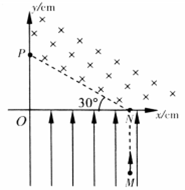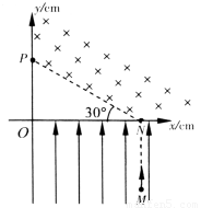 (10分)如图所示,在xOy坐标系中,x轴上N点到O点的距离是12cm,虚线NP与x轴负向的夹角是30°.第Ⅰ象限内NP的上方有匀强磁场,磁感应强度B=1T,第IV象限有匀强电场,方向沿y轴正向.一质量m=8×10-10kg.电荷量q=1×10-4C带正电粒子,从电场中M(12,-8)点由静止释放,经电场加速后从N点进入磁场,又从y轴上P点穿出磁场.不计粒子重力,取