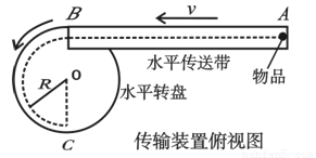 (13分)如图为某工厂生产流水线上水平传输装置的俯视图,它由传送带和转盘组成。物品(质量m=1kg)从A处无初速放到传送带上,运动到B处后进入匀速转动的转盘,设物品进入转盘时速度大小不发生变化,并随转盘一起运动(无相对滑动),到C处被取走装箱。已知A、B两处的距离L=9m,传送带的传输速度