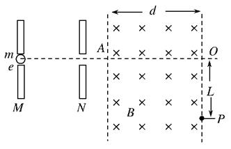 电子自静止开始经M? N板间(两板间的电压为U)的电场加速后从A点垂直于磁场边界射入宽度为d的匀强磁场中,电子离开磁场时的位置P偏离入射方向的距离为L,如图所示.求: